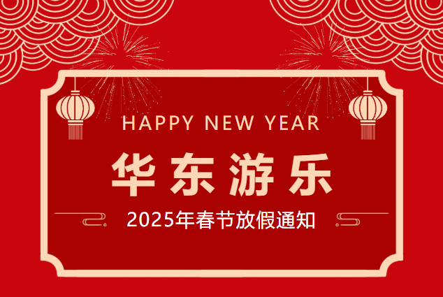 华 东 游 乐 2025年春节放假通知 根据国家关于法定节假日的规定,并且结合公司实际情况,现对2025年春节放假作如下安排。 放假时间: 2025年1月22日至2025年2月6日 (农历:腊月廿三至正月初九) 2025年2月7日(农历正月初十)正式开工。 注意事项: 1、春节期间避开景点高峰期,方便旅行; 2、要切实提高安全意识,注意交通安全和防火、防……