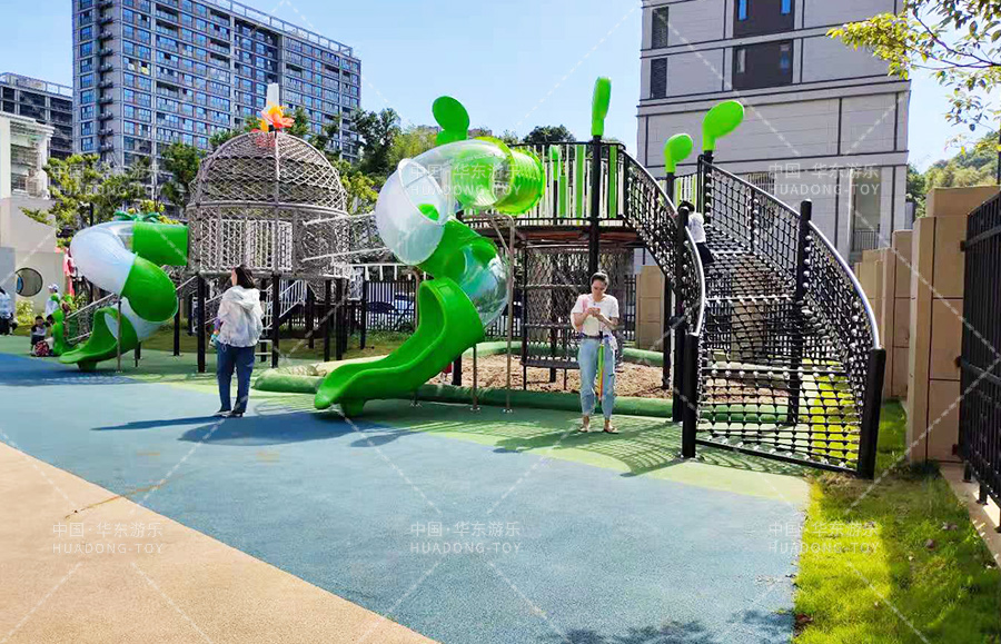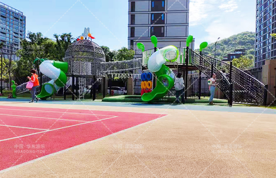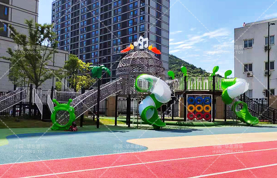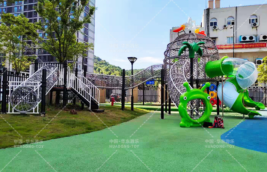 舟山市畚斗岙幼儿园此次选用的是又333体育游乐自主研发和设计的网绳系列户外滑梯组合,具备了爬网、钻洞、滑梯、滑桶、吊环、攀爬梯、沙池等游乐设备,能够让小朋友在玩耍中得到很好的锻炼和学习。