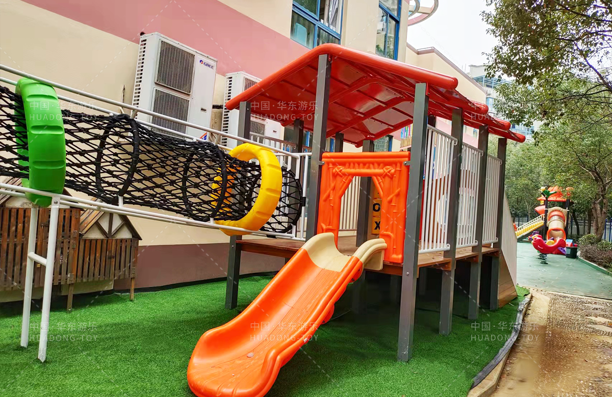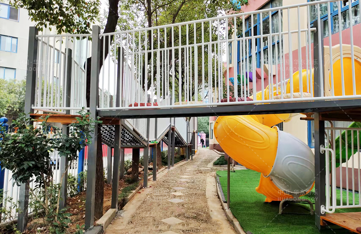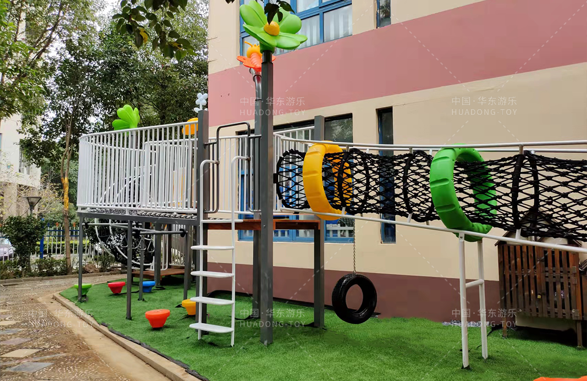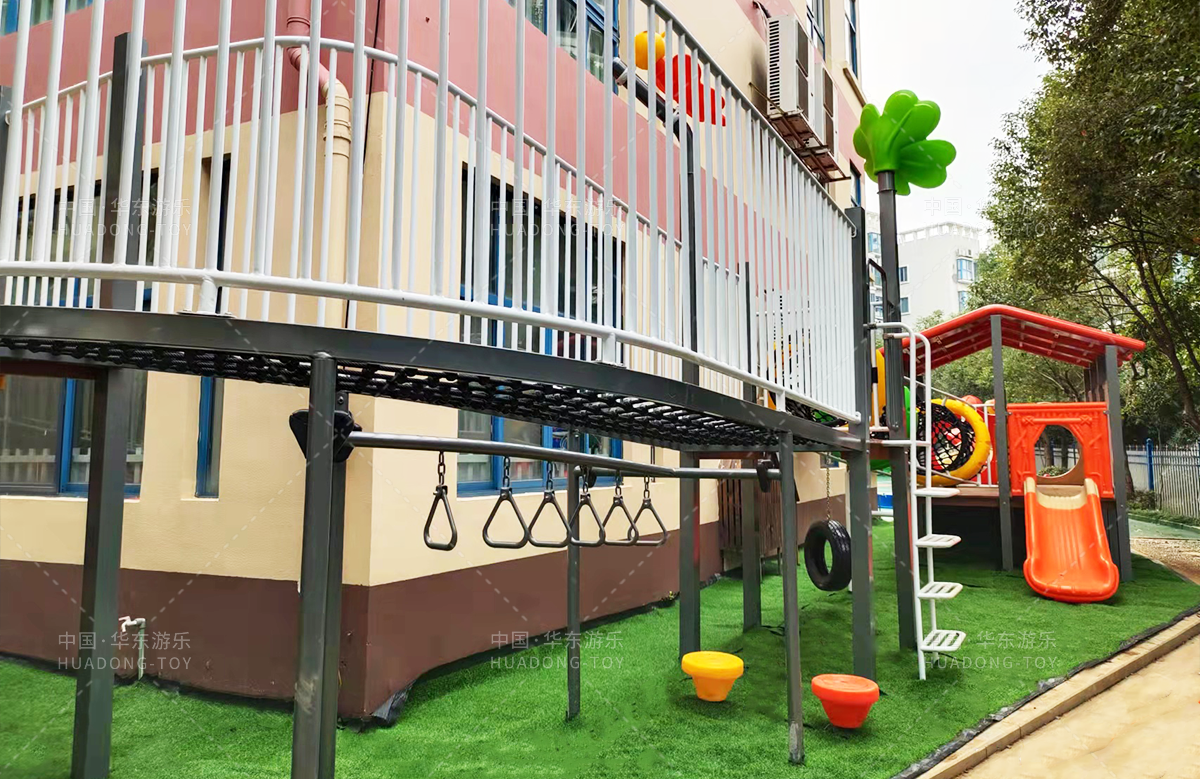 绿都幼儿园选用的是333体育游乐自主研发的具有攀爬、滑梯、爬网、钻洞、葫芦攀爬为一体的综合性游乐设备。