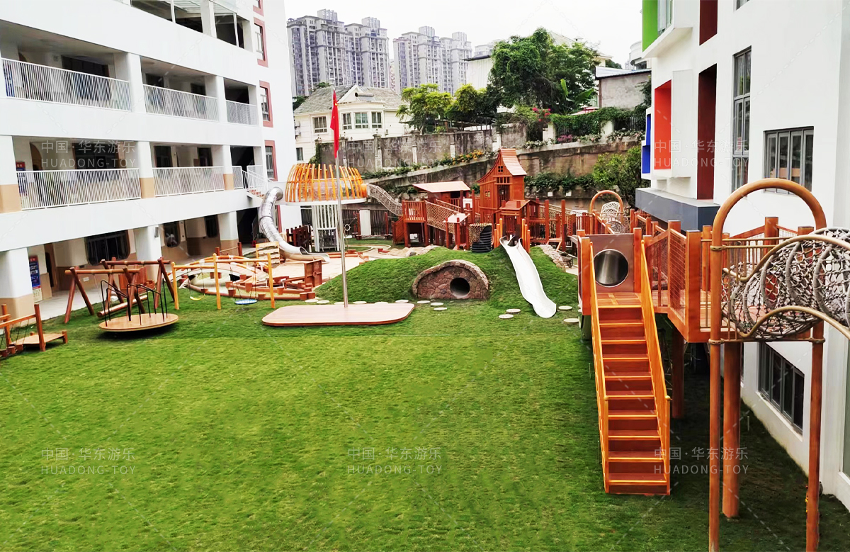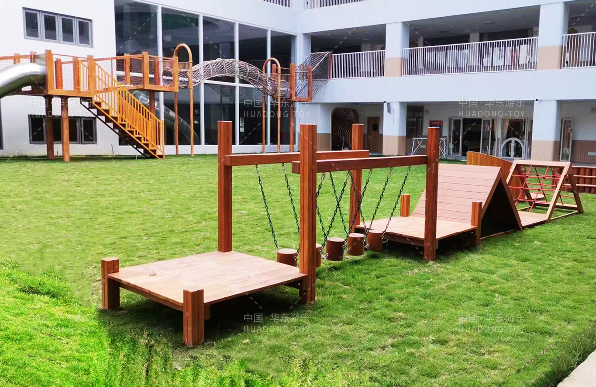 高峰幼儿园是一个专业的学前教育培训机构,此次选用的是333体育游乐设计和生产的木制非标定制的游乐设备,设计了具有攀爬网、钻洞、秋千、木制拓展、木制小屋、不锈钢滑梯等功能的游乐设备,丰富的功能、优质的设备、让整个校园充满了生机与活力。