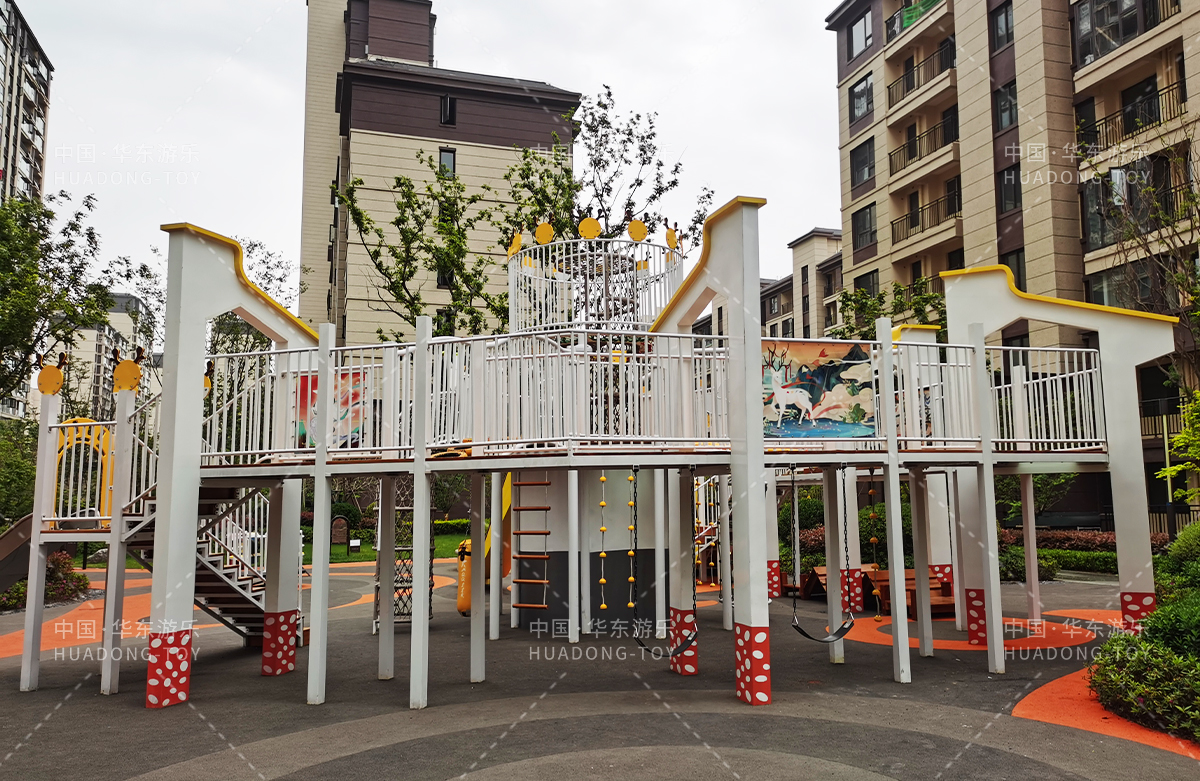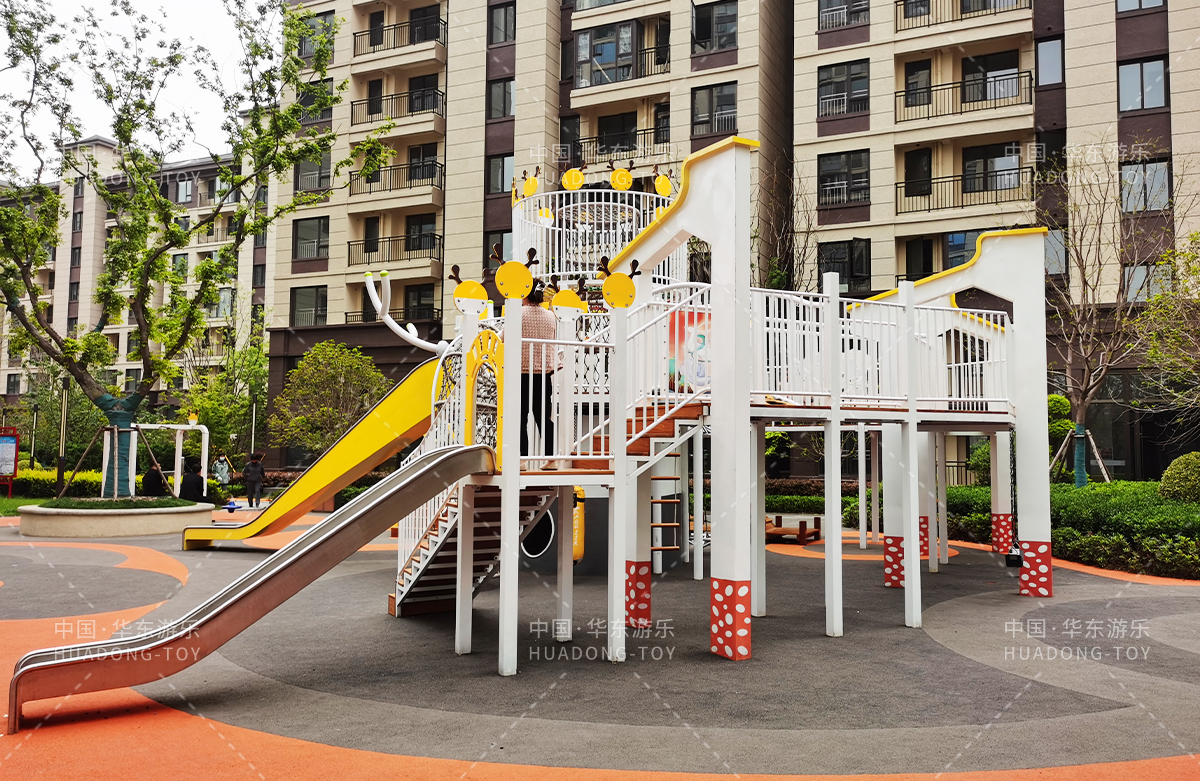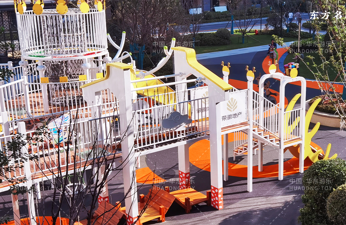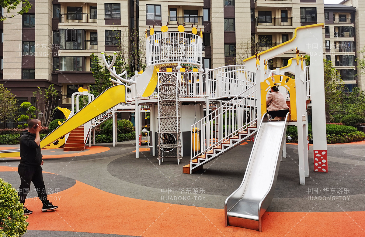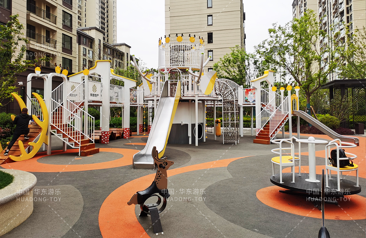 东方名府云著此次选用的是333体育游乐自主研发和生产的无动力游乐设备,采用的是以麋鹿为主题的综合性游乐园,整个游乐园分别设计了小朋友喜欢的儿童跷跷板、打击乐器、儿童摇摇乐,以及和具备不锈钢滑梯、攀爬网、攀爬绳、攀爬梯等功能的麋鹿组合滑梯等游乐设备。