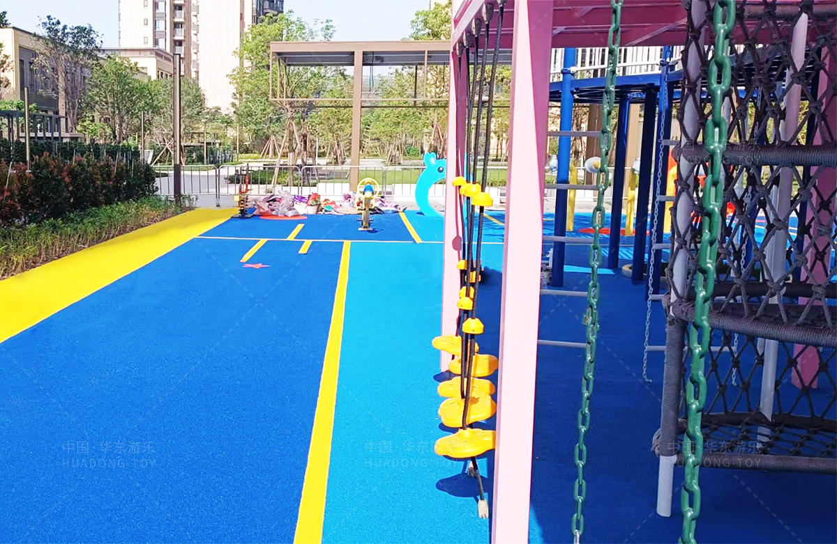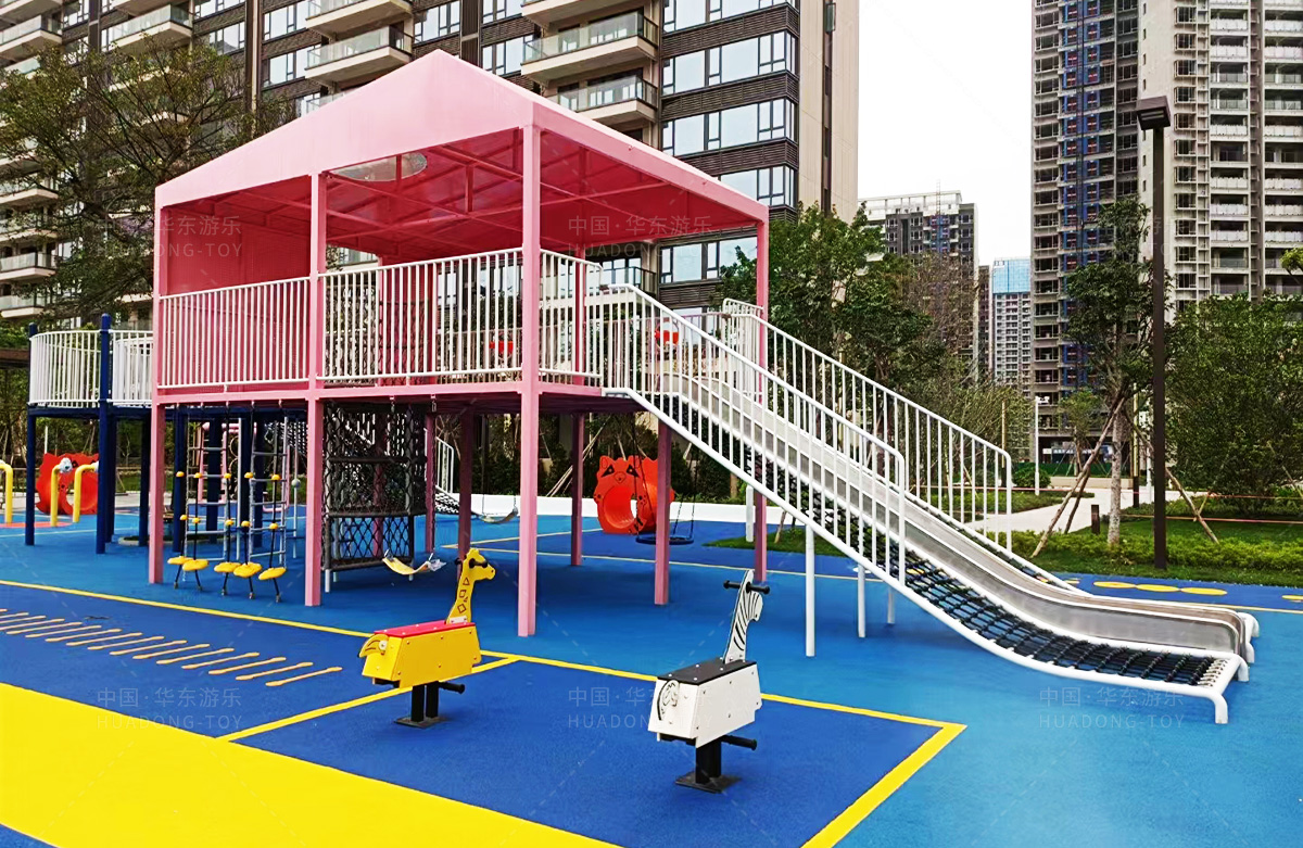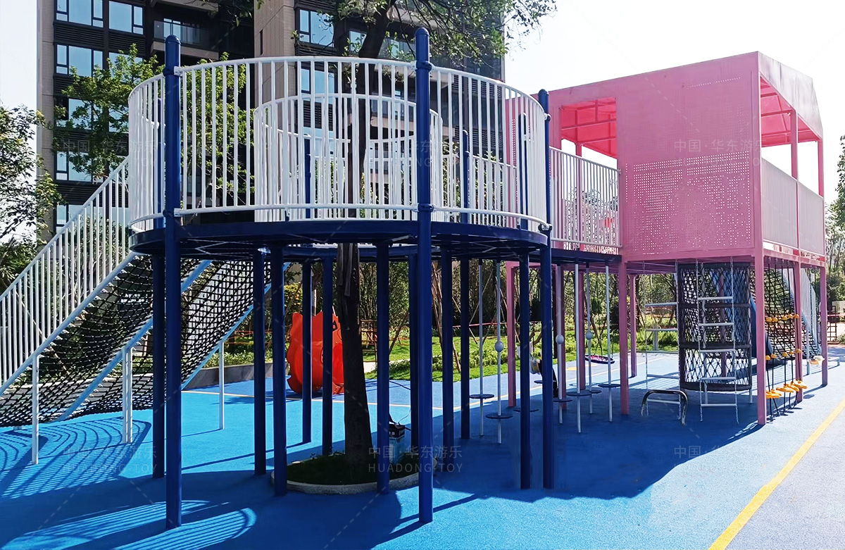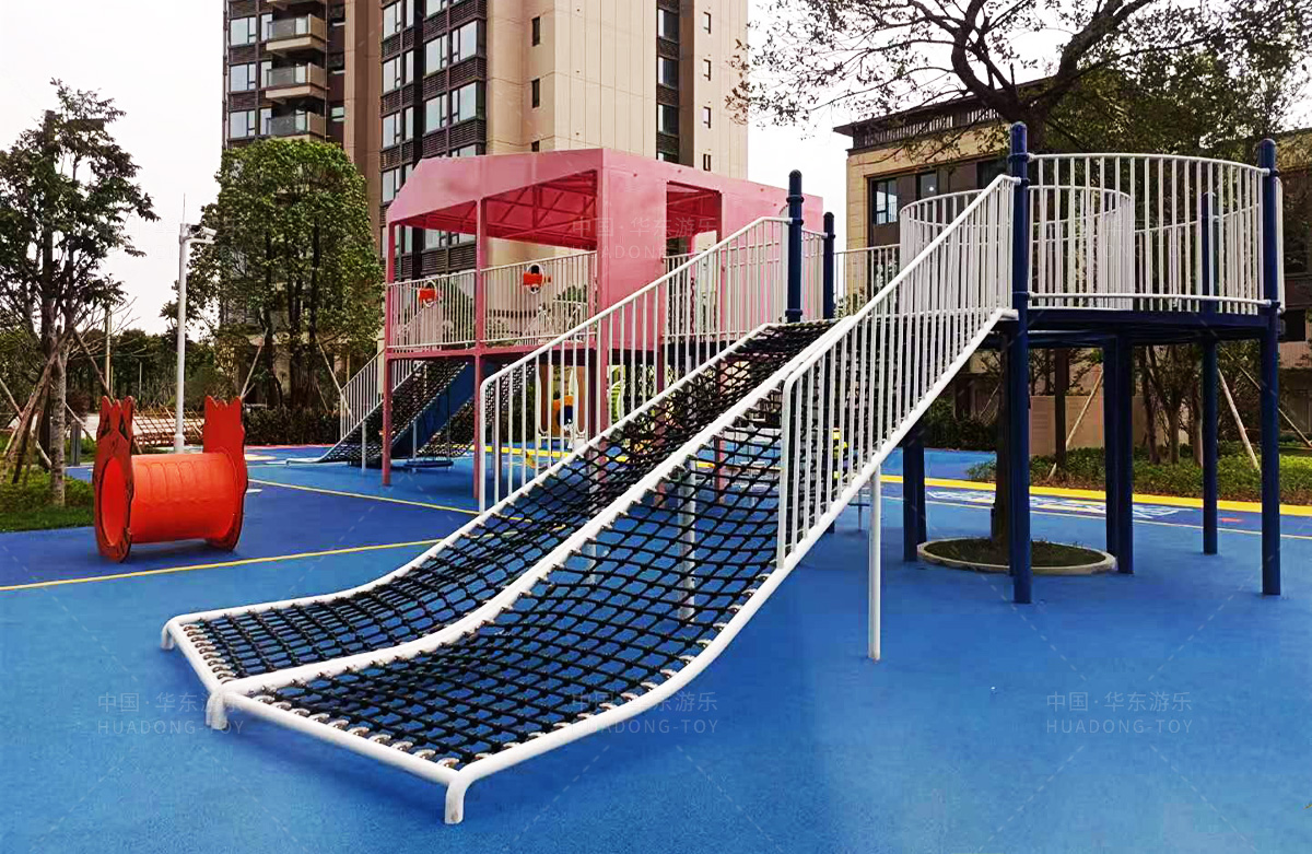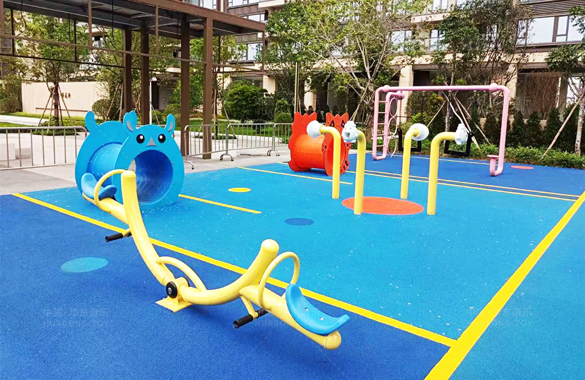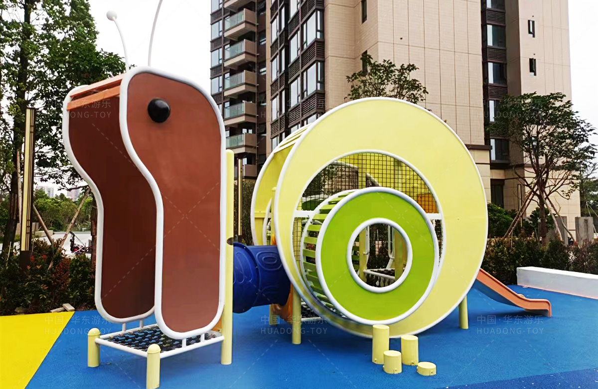 该房地产选用的是333体育游乐设计和生产的非标定制系列的游乐设备,分别设置了跷跷板、摇摇乐、钻洞、传声筒、蜗牛主题组合滑梯,以及具有钻洞、攀爬网、攀爬绳、攀爬梯等功能为一体的空中小屋的游乐设备,该游乐园的建设不仅仅丰富了小区人们的休闲生活,还为小朋友提供了一个休闲、娱乐的场所。