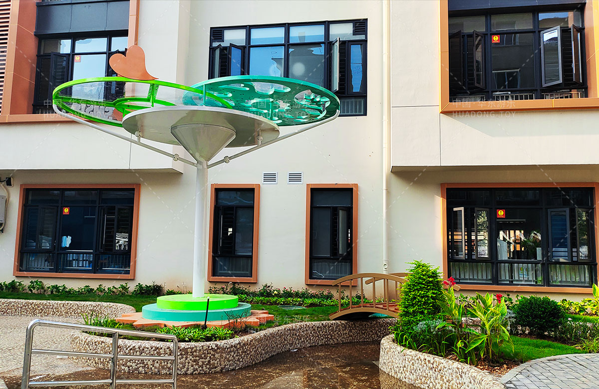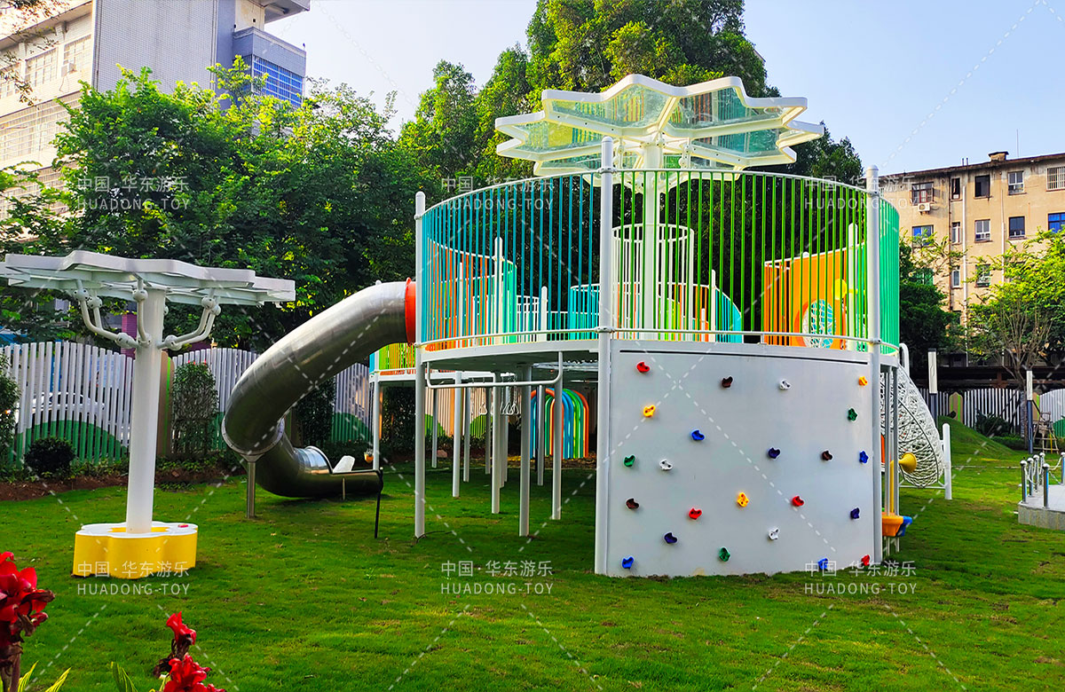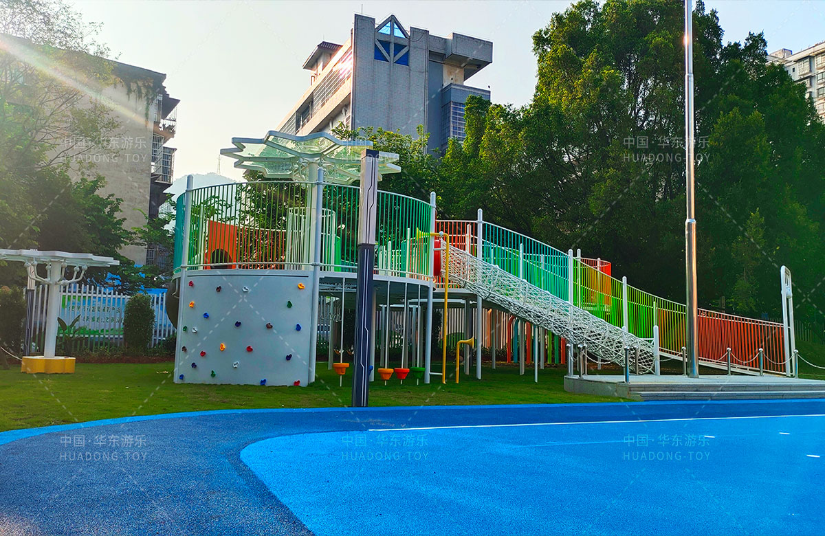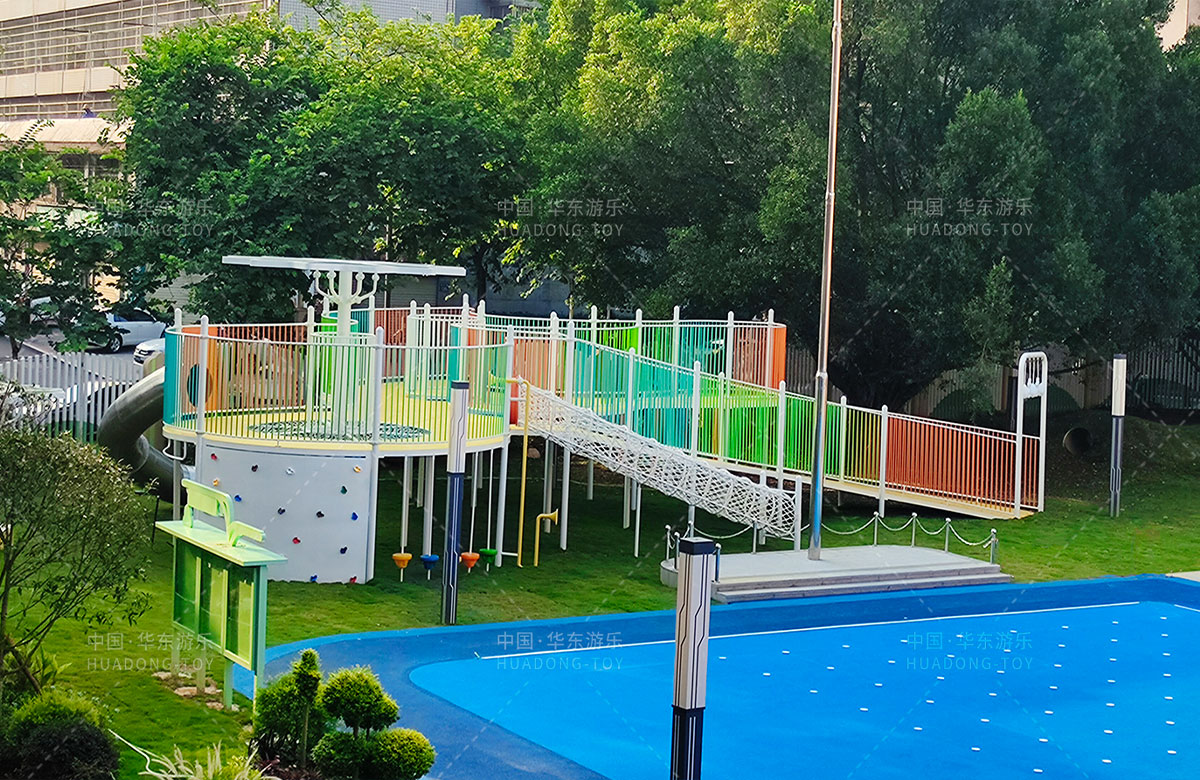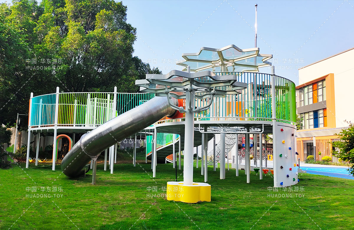 三明市实验幼儿园 选用的是333体育游乐自主研发和设计的非标定制系列的组合游乐设备,是一款具备了攀爬网、空中网桥、攀爬墙、儿童秋千、大型滑筒、平衡吊环、彩虹桥等功能,除此之外还设置了树形休闲厅、木制小桥等游乐设备,让孩子们有一个健康的成长环境,也为老师的教学提供了保障。