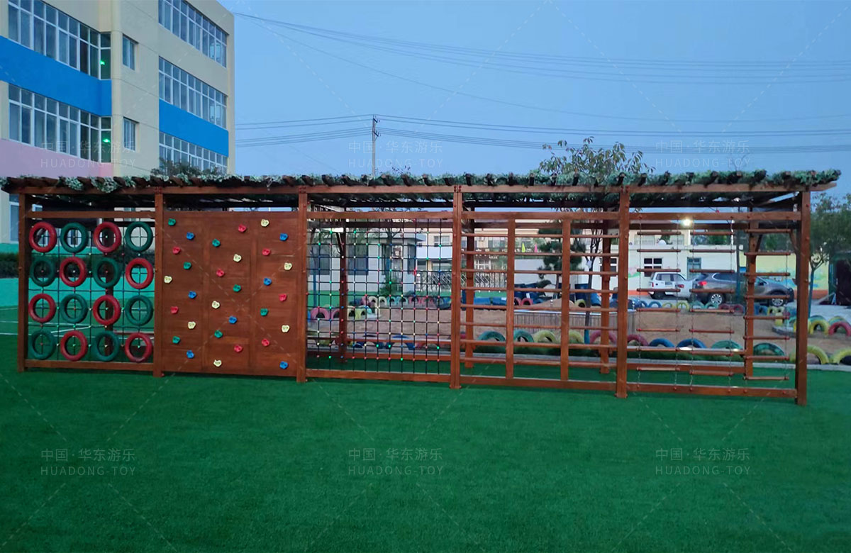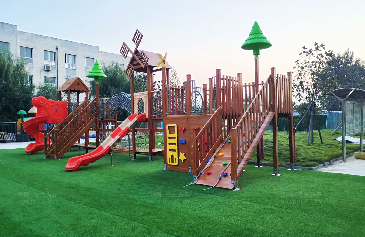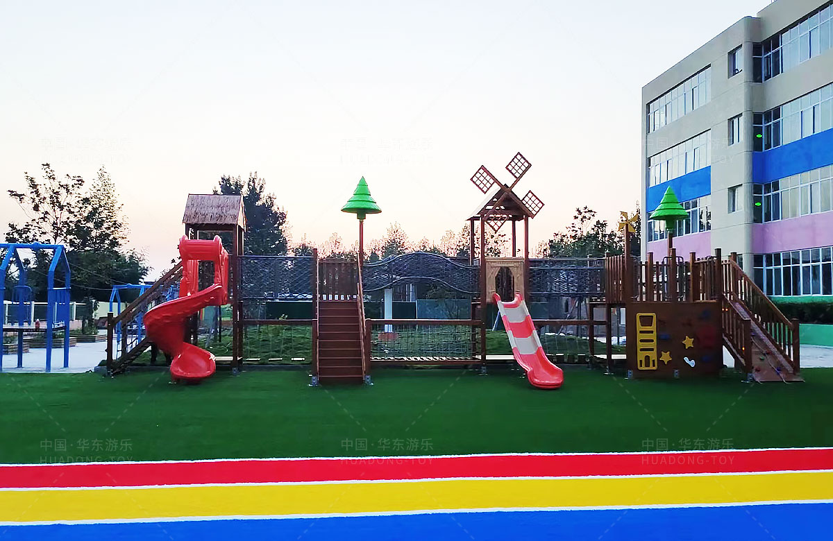 团林镇中心幼儿园是一所专业性的学期教育学校,此处选用的是333体育游乐自主研发和设计的魔法屋系列组合滑梯和木制拓展游乐设备,具备了攀爬、钻洞、滑梯、攀爬网、攀爬梯等功能为一体,不仅仅为小朋友提供了一个很好的游乐环境,也为老师的教学提供了帮助。