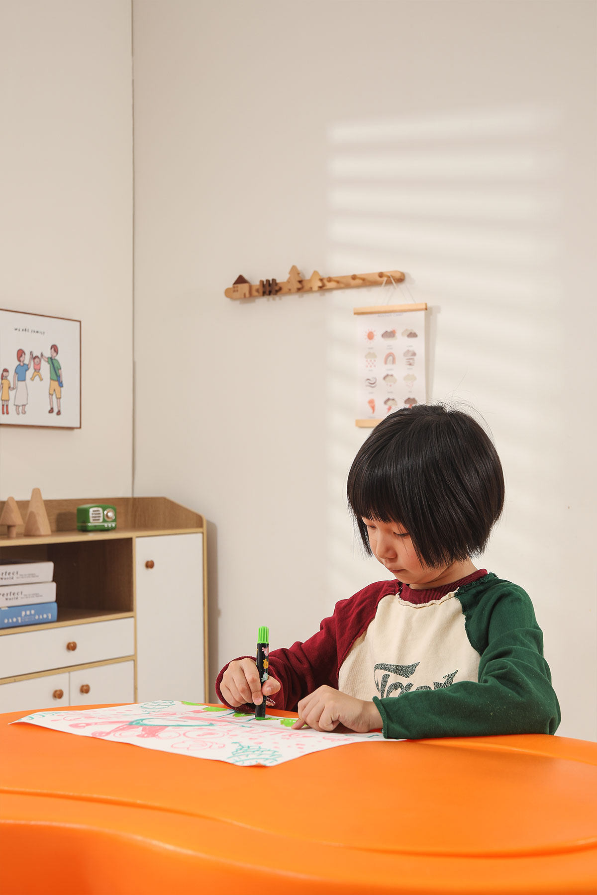 储物柜的设计充分考虑了儿童的收纳需求,柜内分隔合理,便于孩子分类存放玩具和学习用品。同时,柜子采用滑动门设计,开合顺畅,安全可靠。