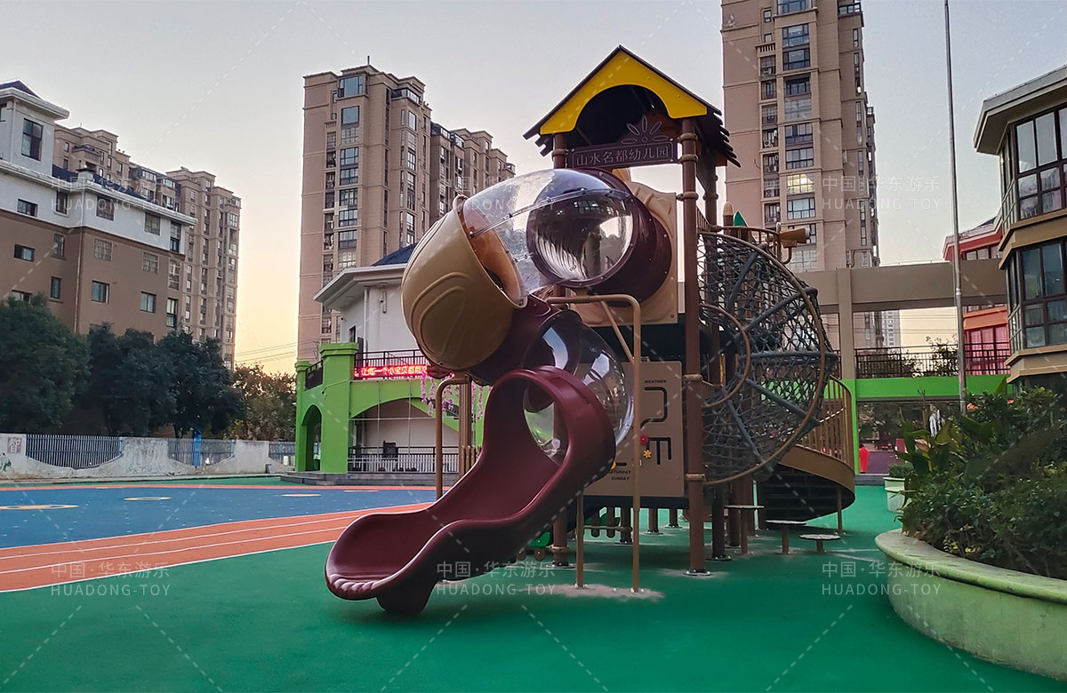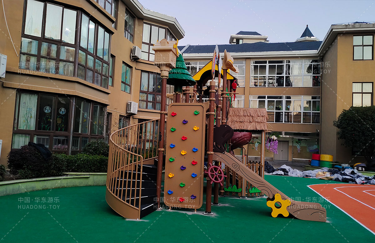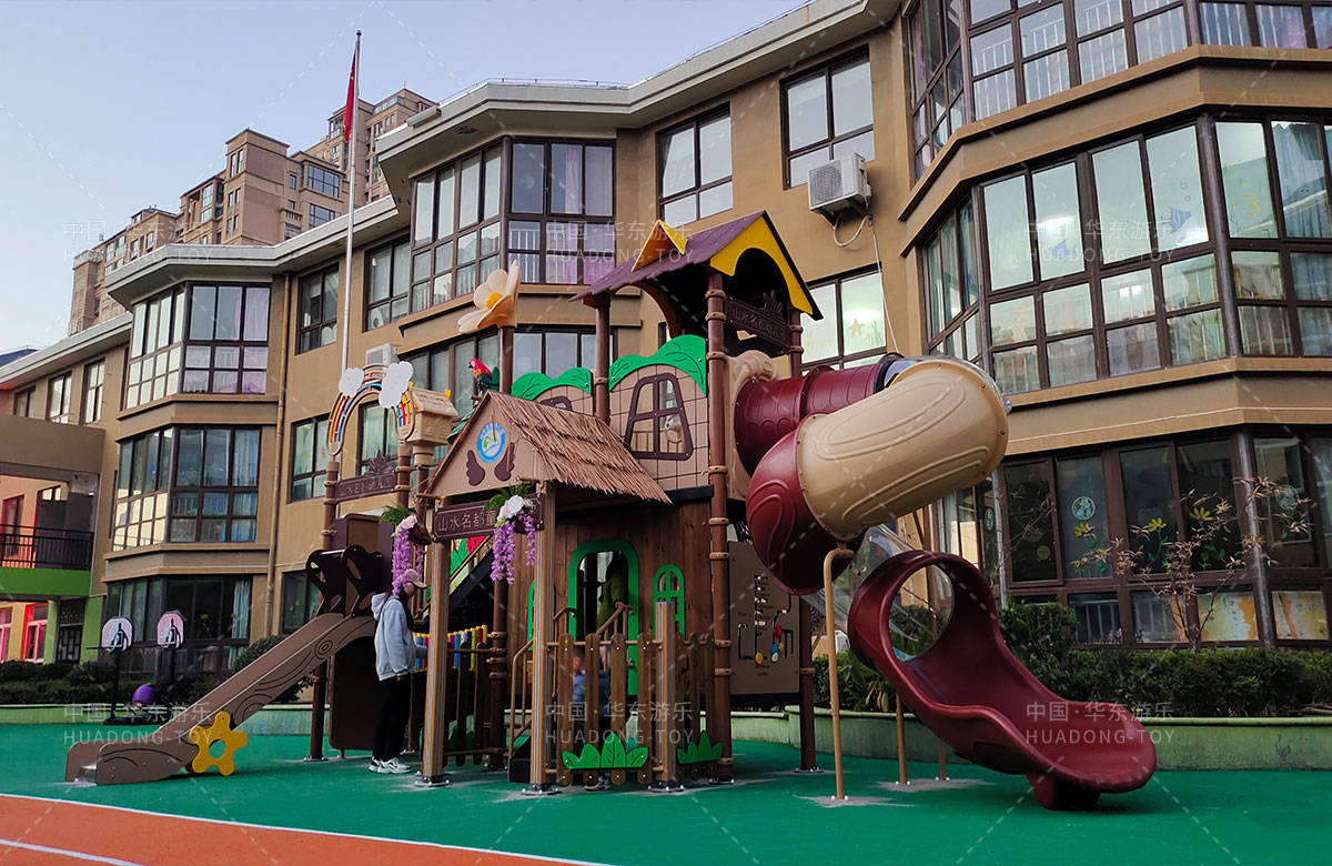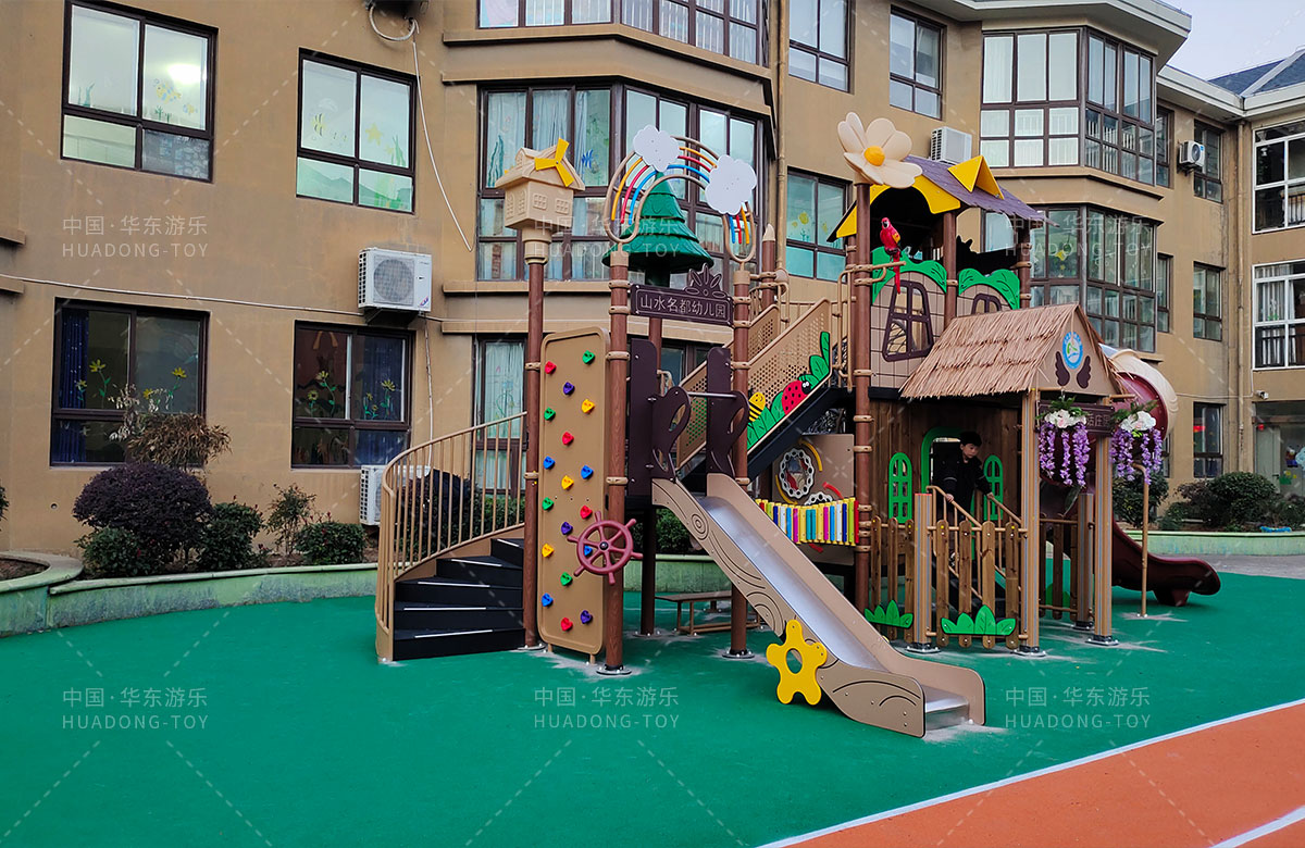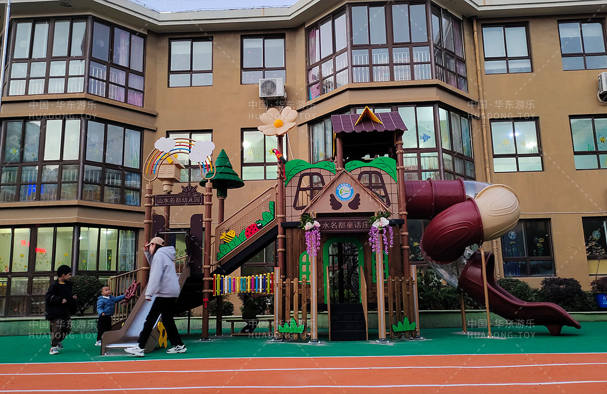 江苏省淮安市山水名都幼儿园是一家专业的学期教育培训机构,此次选用的是333体育游乐自主研发和设计的通话庄园系列组合滑梯,该设备具备了攀爬网、攀爬墙、打击乐器、旋转滑梯等功能,是一款功能齐全、主题鲜明、颜色艳丽、品质优越的综合性游乐设备,非常适合幼儿园。