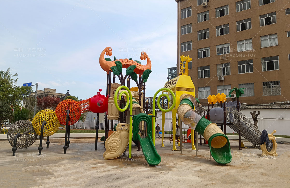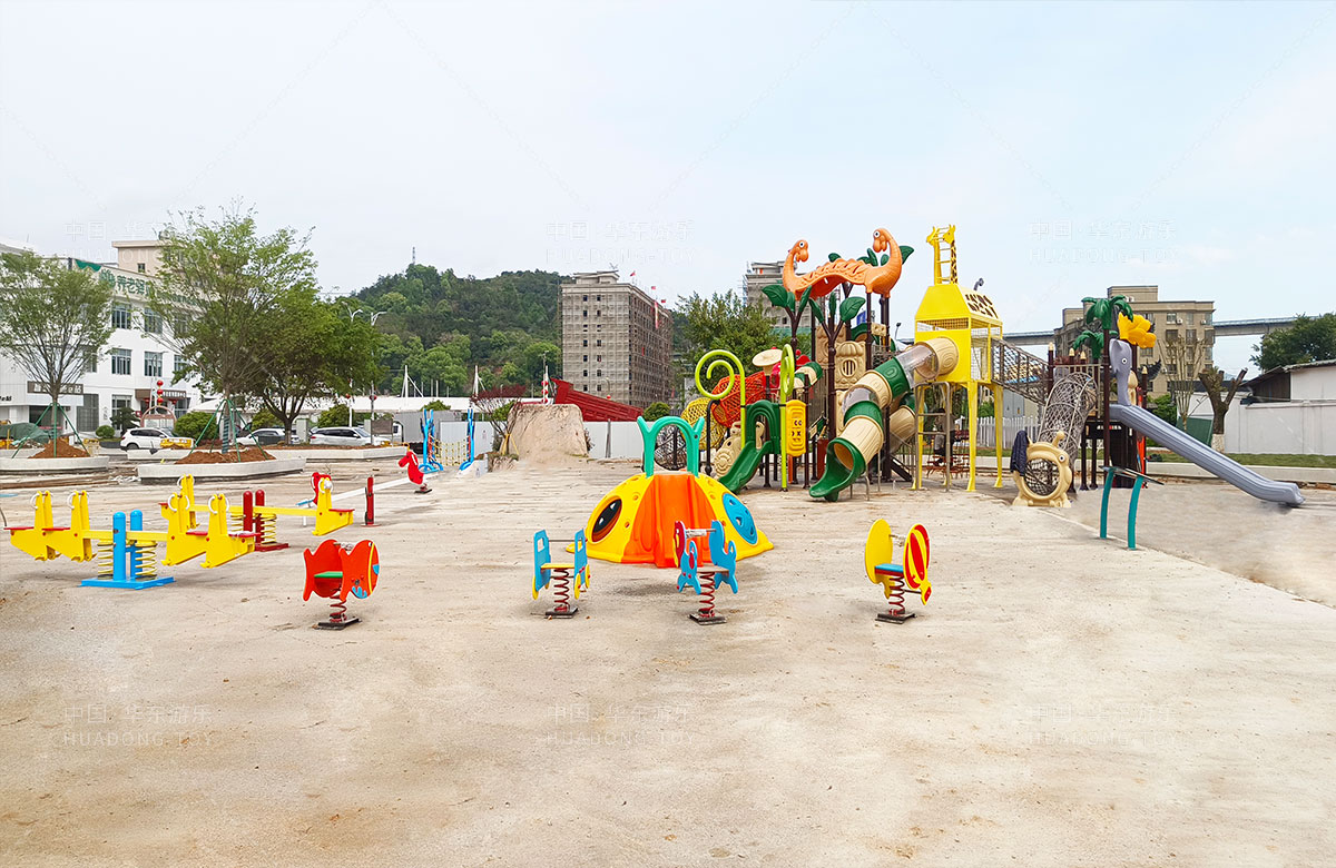 乐清市溪西工业园区休闲文化生态园是一个免费的文旅公园,主要为生活在这里的人群提供一个休闲、娱乐、遛娃、健身的场所,在该项目中选用的的333体育有了自主研发和生产的动物系列组合滑梯,该滑梯具有功能齐全、玩法多样、颜色艳丽等特点,除此之外还新增了儿童 摇摇乐、组合秋千、跷跷板、打击乐器、脚踏旋转座椅等游乐设备。
