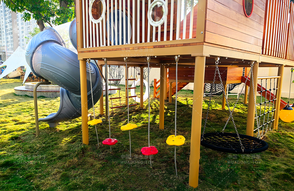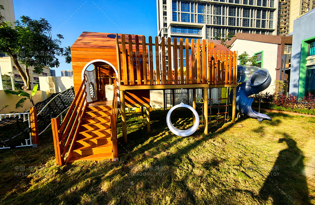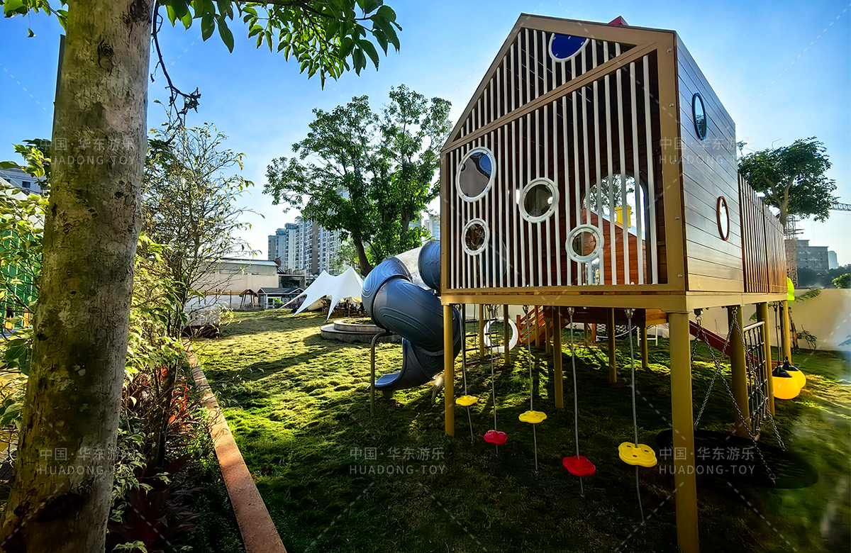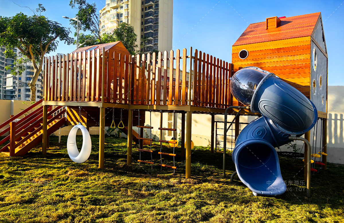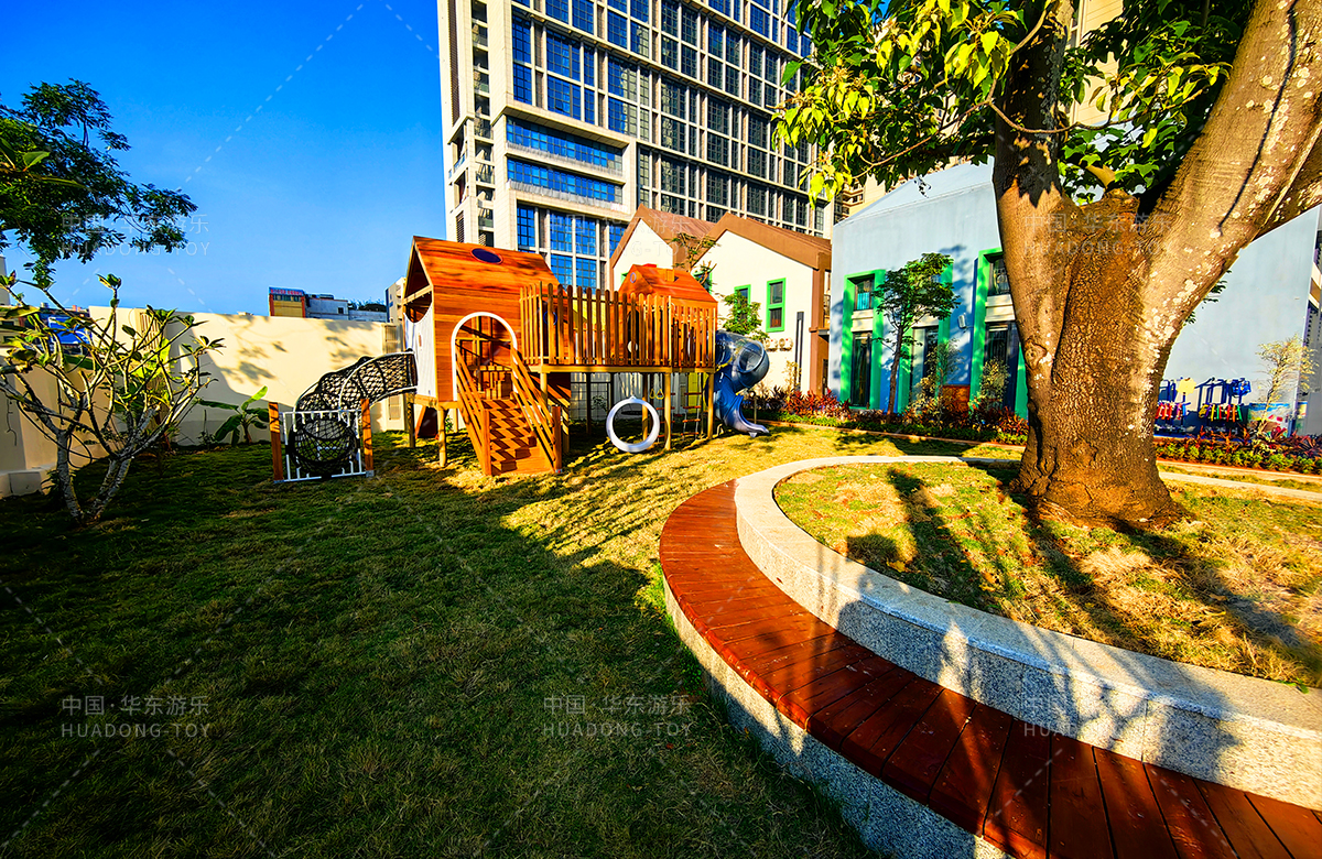 海南省农垦总局机关幼儿园选用的是333体育游乐自主研发和设计的木质系列非标定制的游乐设备,该游乐设备具备了攀爬网、攀爬梯、月亮秋千、旋转滑梯、儿童秋千、平衡绳等功能为一体,该游乐设备的设置不仅仅为孩子们的玩耍提供看保障,更是为老师的教学提供了帮助。